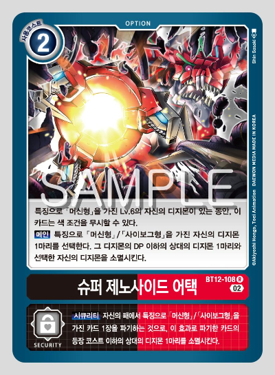 자신의 머신, 사이보그형을 선택하고, 그 디지몬과 그 디지몬의 DP 이하의 상대 디지몬 1체를 소멸시키는 효과를 가지고 있다.