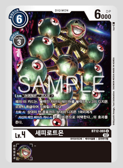 5코스트로 진화할 수 있으며, 상대 턴 효과를 가지고 있는데, 상대가 공격할 때 덱 위의 3장을 공개하고 6 코스트 이하의 블랙 디지몬을 등장, 나머지는 파기한다.
