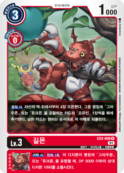 진화원 효과 :【어택 시】【턴 1회】이 디지몬이 명칭에「길몬」이나「그라우몬」이나「듀크몬」을 포함할 때,【1 드로우】(자신의 덱에서 카드를 1장 뽑는다).