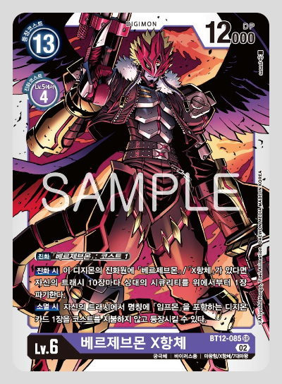 디지크로스를 해도 등장 코스트는 10으로 꽤 무거운 편인데, 등장 또는 진화 시 상대의 디지몬을 한 마리 삭제하고, 트래시에서 바그라군 속성의 디지몬을 5장까지 진화 원으로 둔다.
