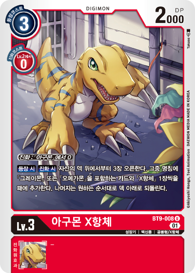 ​진화원 효과 :【자신의 턴】이 디지몬이 명칭에「아구몬」이나「그레이몬」을 포함하는 동안 이 디지몬을 DP + 1000.