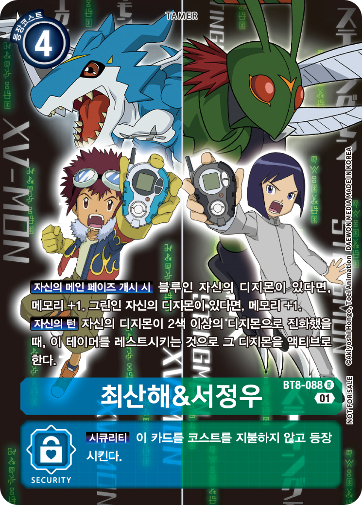 【자신의 메인페이즈 개시 시】청색의 자신의 디지몬이 있을 때, 메모리를 + 1. 녹색의 자신의 디지몬이 있을 때, 메모리 + 1.