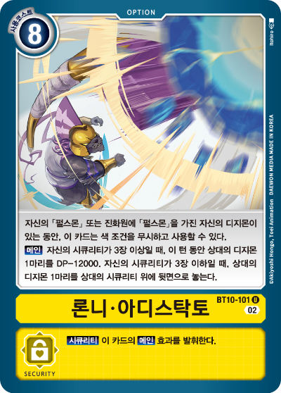 【메인】 자신의 시큐리티가 3장이상일 때, 이 턴 동안 상대의 디지몬 1체를 DP - 12000. 자신의 시큐리티가 3장이하일 때, 상대의 디지몬 1체를 상대의 시큐리티의 위에 뒷면으로 둔다.