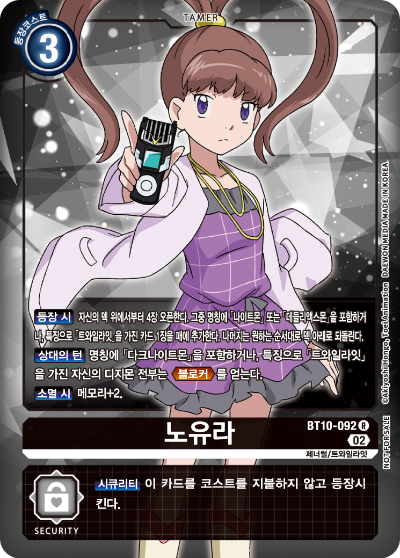 시큐리티 : 【시큐리티】 자신의 덱 위에서 3장 오픈한다. 그 중의 등장 코스트 4 이하인 디지몬 카드 1장을 코스트를 지불하지 않고 등장시킬 수 있다. 남은 카드는 좋아하는 순서대로 덱 아래로 되돌린다. 그 후, 이 카드를 패로 추가한다.