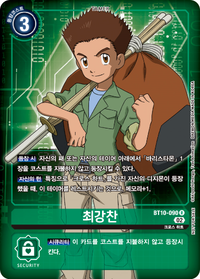 시큐리티 : 【시큐리티】 자신의 덱 위에서 3장 오픈한다. 그 중의 특성에 「크로스하트」를 가진 디지몬 카드 1장을 패에 추가하고 「강태성」1장을 코스트를 지불하지 않고 등장시킬 수 있다. 남은 카드는 좋아하는 순서대로 덱 아래로 되돌린다.