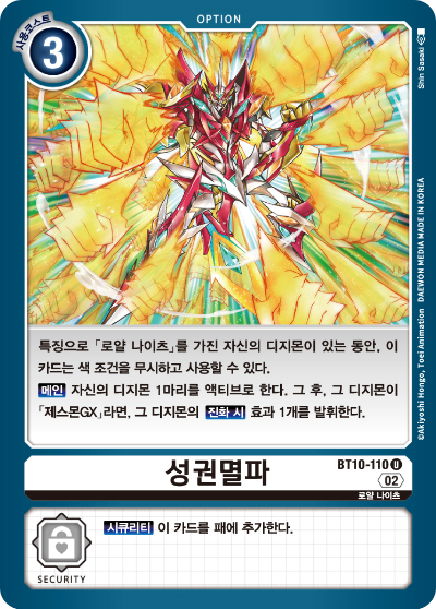 시큐리티 : 【시큐리티】 자신의 덱 위에서 3장 오픈한다. 그 중의 특성에 「크로스하트」를 가진 디지몬 카드 1장을 패에 추가하고 「강태성」1장을 코스트를 지불하지 않고 등장시킬 수 있다. 남은 카드는 좋아하는 순서대로 덱 아래로 되돌린다.