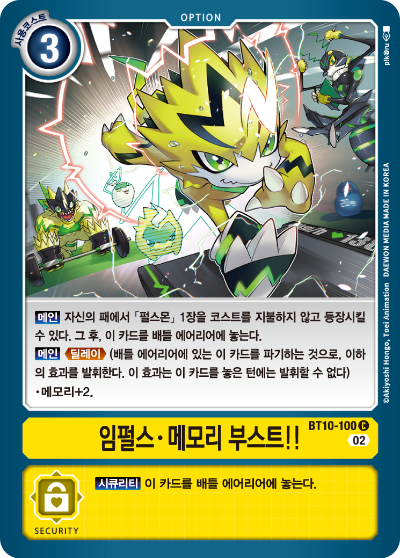 시큐리티 : 【시큐리티】 자신의 덱 위에서 3장 오픈한다. 그 중의 등장 코스트 4 이하인 디지몬 카드 1장을 코스트를 지불하지 않고 등장시킬 수 있다. 남은 카드는 좋아하는 순서대로 덱 아래로 되돌린다. 그 후, 이 카드를 패로 추가한다.