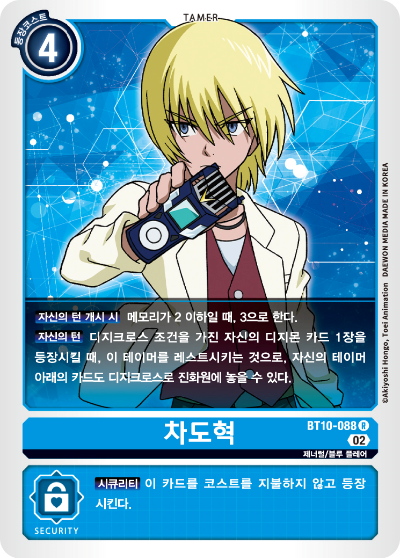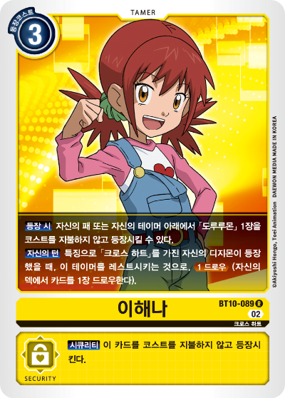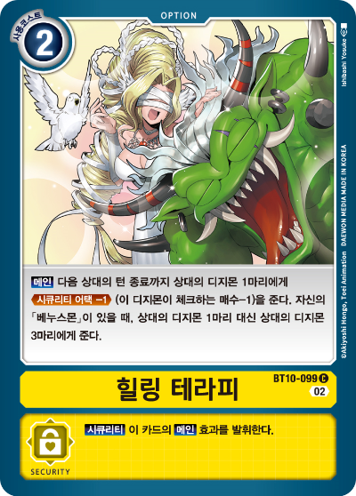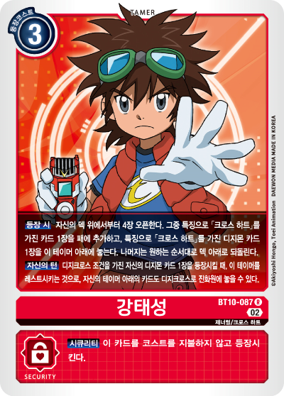 시큐리티 : 【시큐리티】 자신의 덱 위에서 3장 오픈한다. 그 중의 특성에 「크로스하트」를 가진 디지몬 카드 1장을 패에 추가하고 「강태성」1장을 코스트를 지불하지 않고 등장시킬 수 있다. 남은 카드는 좋아하는 순서대로 덱 아래로 되돌린다.