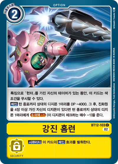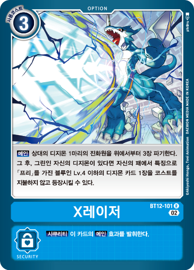 시큐리티 : 【시큐리티】 자신의 패에서 특성에 「사이보그형」이나 「머신형」을 가진 카드 1장을 파기하는 것으로 파기한 카드의 등장 코스트 이하의 상대의 디지몬 1체를 소멸시킨다.