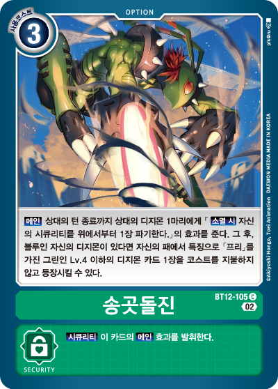 【메인】 다음 상대의 턴 종료시까지 상대의 디지몬 1체에 「【소멸 시】 자신의 시큐리티를 위에서 1장 파기한다.」의 효과를 부여한다. 그 후, 청색의 자신의 디지몬이 있을 때, 자신의 패에서 특성에 「프리」를 가진 녹색의 LV.4 이하의 디지몬 카드 1장을 코스트를 지불하지 않고 등장시킬 수 있다.