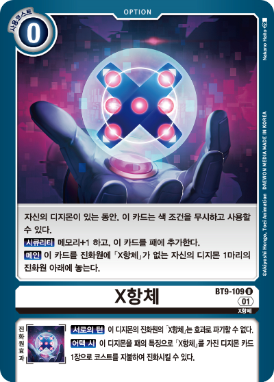 【메인】이 카드를 진화원에「X항체」가 없는 자신의 디지몬 1체의 진화원의 아래에 둔다.