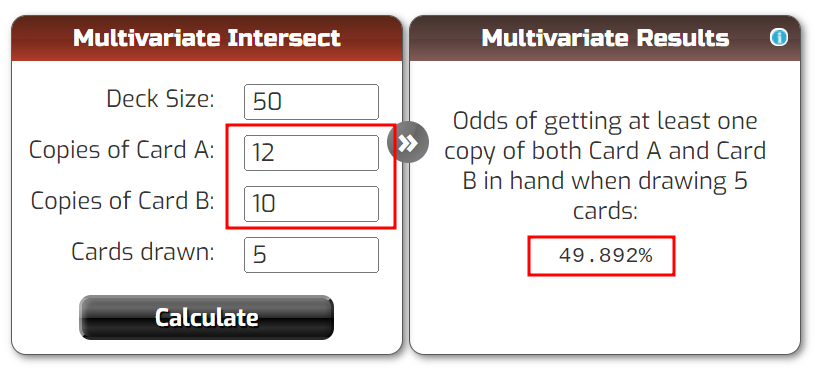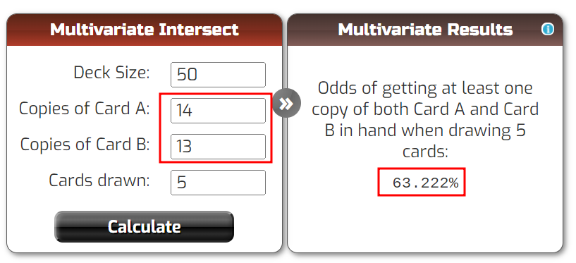 이 계산기에는 덱 내에 찾고자 하는 2종류의 카드 장수를 입력하여, 첫 패나 상위 X장의 카드에서 두 카드 콤보를 뽑을 확률을 확인할 때, 선호하는 카드를 얼마나 자주 뽑을 수 있을지 계산할 때 유용하다.