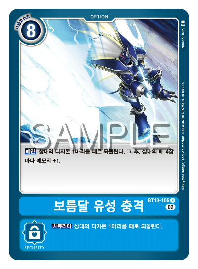 1탄의 오메가몬과 다른 모 게임의 바이러스 효과를 떠올리는 효과지만, 이 효과는 상대의 트래시에 어떤 디지몬이 있는가에 따라 제한되는 효과이기 때문에 조금은 수동적인 효과로 보인다.