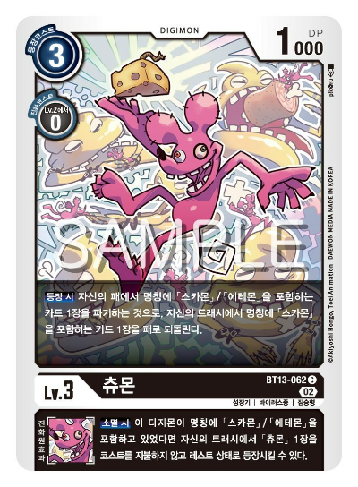 가장 먼저 살펴볼 디지몬은 츄몬으로, 이 디지몬은 등장 시 패에서 스카몬/에테몬을 파기하면서 트래시에서 스카몬 명칭을 포함한 디지몬을 패로 가져올 수 있다.