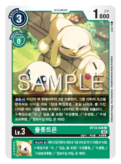 이 디지몬은 등장 시 효과와 진화 시 효과를 가지고 있으며, 덱의 3장을 오픈하여 등장 코스트 10 이하의 콩알몬을 등장시킬 수 있다.