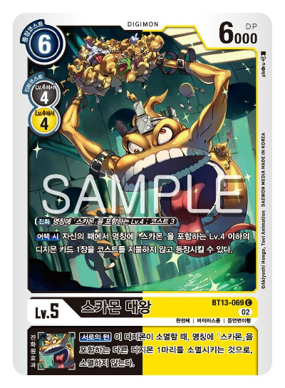 이번에는 어택 시 효과로 손에서 코스트를 지불하지 않고 스카몬을 등장시킬 수 있는 능력을 갖추고 있어, 기존의 스카몬 대왕은 상대의 디지몬을 무력화하는 방향으로 필드를 장악했다면, 이번 스카몬 대왕은 스카몬의 횡전개(똥밭)로 필드를 장악해 나갈 것으로 보인다.