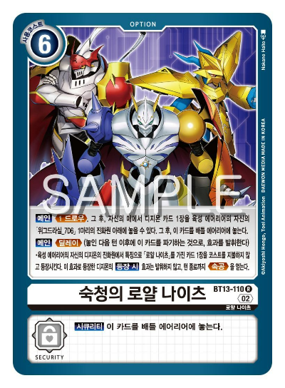 다른 로얄 나이츠를 등장시켰을 때, 상대의 레벨 4 이하 디지몬을 모두 파괴할 수 있어 강력한 필드 제압을 가능하게 합니다.