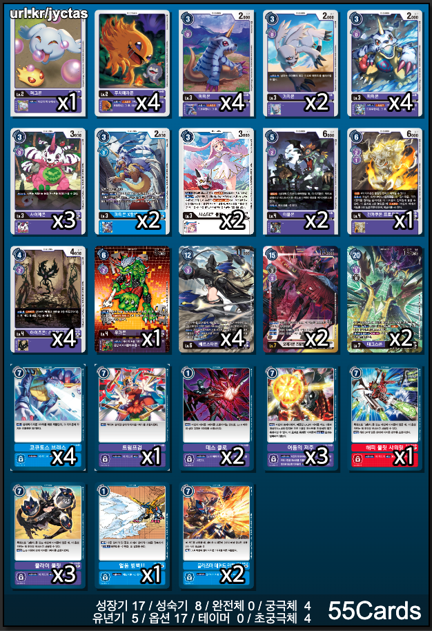 테이머 카드를 사용한다면 코스트가 너무 무겁고, 필요한 타이밍에 청색 옵션 카드를 발휘하기 힘들 것이라 생각했고, 그래서 0코스트로 바로 청색을 발동할 수 있는 파피몬 X 항체를 채용했다.