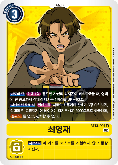 【메인】 다음 상대의 턴 종료시까지 상대의 디지몬 1체를 DP - 12000. 그후, 자신의 패에서 「최건우」 1장을 코스트를 지불하지 않고 등장시킬 수 있다.