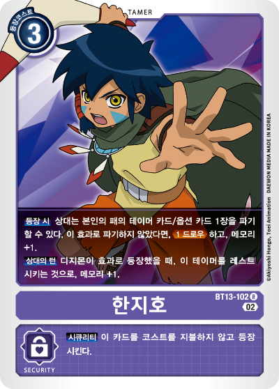 시큐리티 : 【시큐리티】 자신의 패에서 디지몬 카드 1장을 파기하는 것으로 파기한 카드의 LV. 이하인 상대의 디지몬 1체를 소멸시킨다.