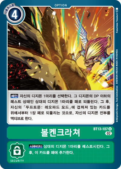 시큐리티 : 【시큐리티】 자신의 패에서 디지몬 카드 1장을 파기하는 것으로 파기한 카드의 LV. 이하인 상대의 디지몬 1체를 소멸시킨다.
