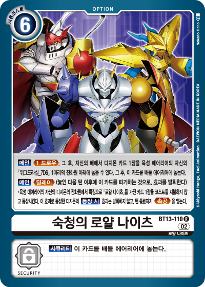 육성 에어리어의 자신의 디지몬의 진화원에 특성에 「로얄나이츠」를 가진 카드 1장을 코스트를 지불하지 않고 등장시킨다.