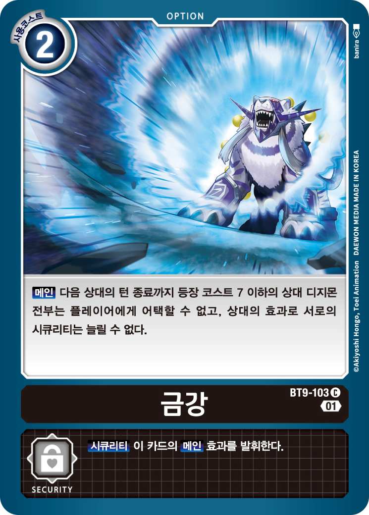 【메인】다음 상대의 턴 종료시까지 등장 코스트 7 이하인 상대의 디지몬 전체는 플레이어에 어택할 수 없고, 상대의 효과로 서로의 시큐리티는 증가하지 않는다.