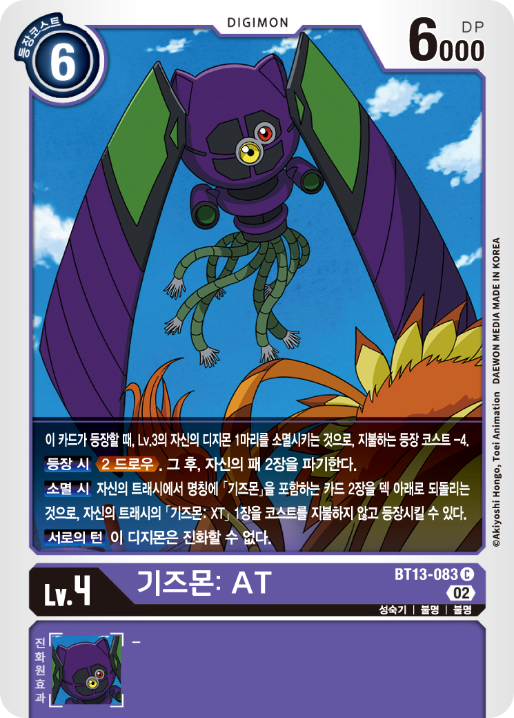 3레벨 디지몬이 상대의 시큐리티를 어택하고 살아남았다면 기즈몬 AT를 2 코스트로 등장하여 2드로 2파기를 할 수 있다.