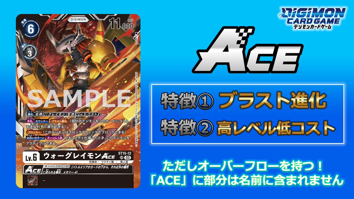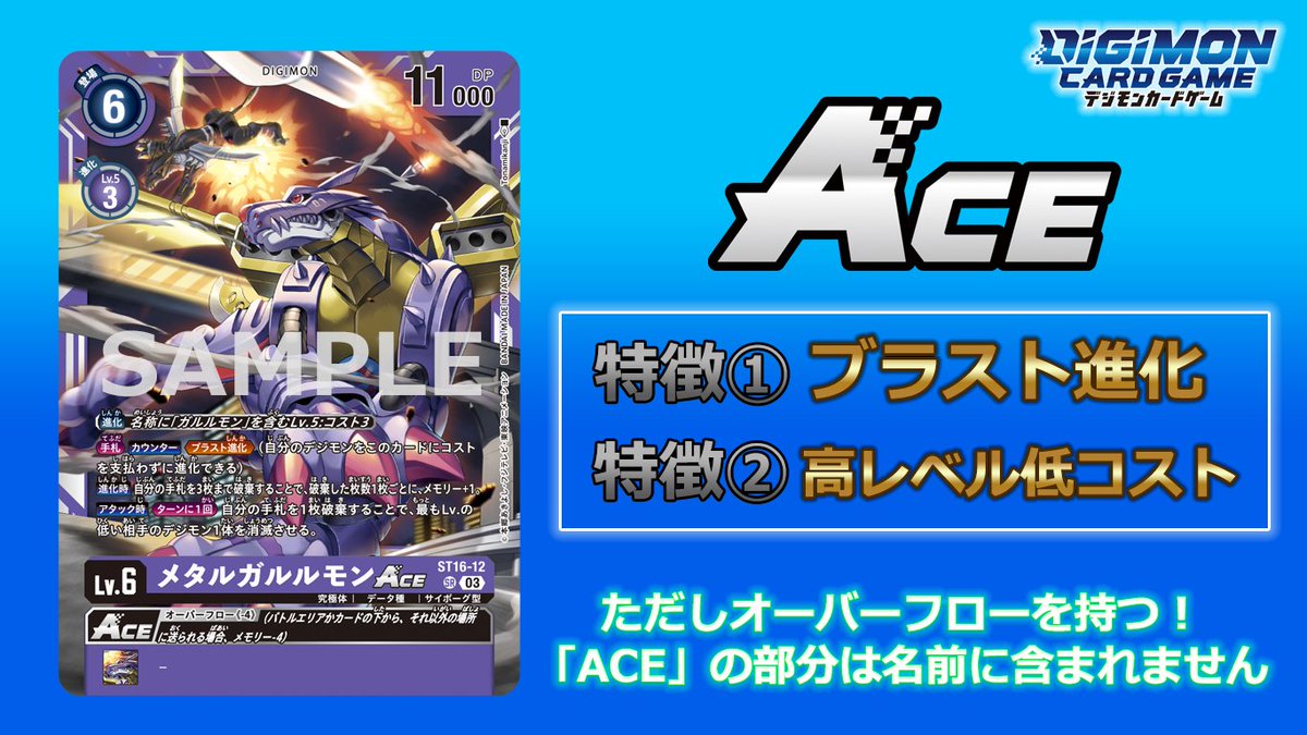 그러나 ACE 디지몬은 뛰어난 성능에도 불구하고, [오버플로우] 효과를 가지고 있어 배틀 에어리어나 진화원에서 제거될 때 페널티를 받는다.
