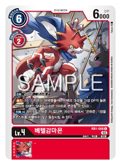 재록카드와 신규카드의 구분이 모호한 점이 눈에 띄데, 이번 RB1의 감마몬, 아구몬, 그레이몬은 기존에 발매된 프로모 카드임에도 신규 넘버링을 받았다는 점이 아쉽다.