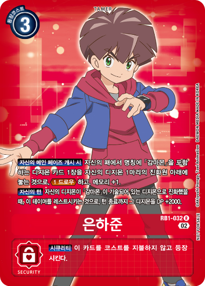 【등장 시】 자신의 덱 위에서 3장 오픈한다. 그 중의 「감마몬」이 적힌 카드와 「은하준」 1장씩을 패에 추가한다. 남은 카드는 좋아하는 순서대로 덱의 아래에 되돌린다.