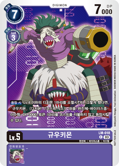 【등장 시】 LV.4 이하인 디지몬 1체를 소멸시킨다. 그랬다면, 「규우키몬」(디지몬·7코스트·LV.5·자색·완전체·바이러스종·마수형·DP 3000)의 토큰 1체를 코스트를 지불하지 않고 등장시킬 수 있다.