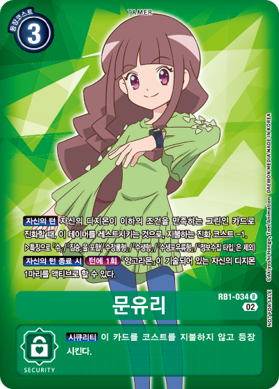 【등장 시】 자신의 덱 위에서 3장 오픈한다. 그 중의 「앙고라몬」이 적힌 카드와 「문유리」 1장씩을 패에 추가한다. 남은 카드는 좋아하는 순서대로 덱의 아래에 되돌린다.