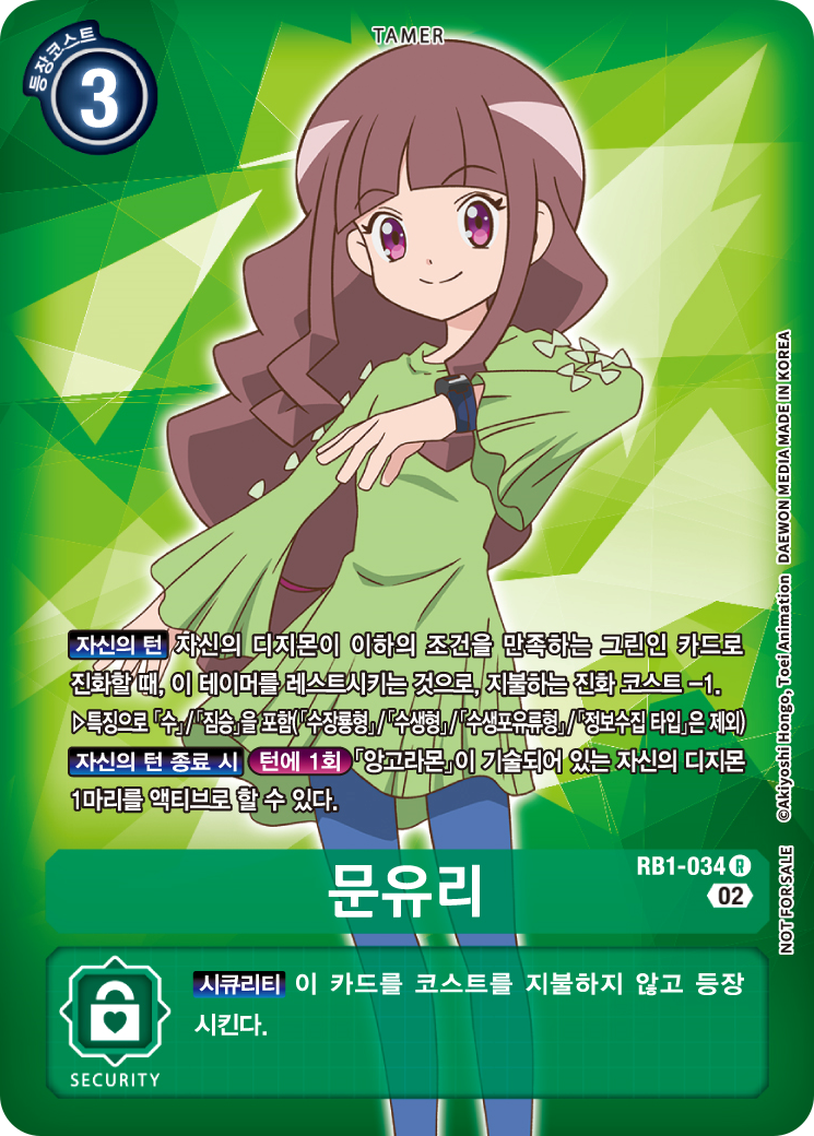 ・자신의 디지몬 1마리를 패의 그린인 디지몬 카드로 지불하는 진화 코스트 -2 하여 진화시킬 수 있다.