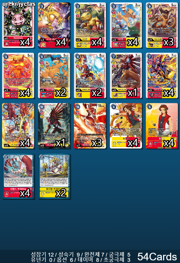 이 덱은 파닥몬의 메인 페이즈 개시 시 효과 덕분에 매우 빠르게 진화할 수 있다.