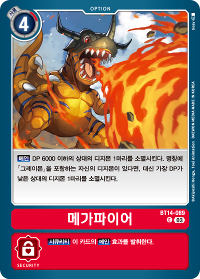 기자몬처럼 어택 시 효과로 DP 참조하여 상대 디지몬을 소멸시키는 효과를 가지고 있다.