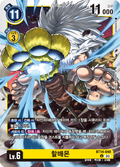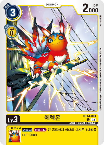 발매일 2025년 2월 19일 BT14-031 / LV.3 / 에렉몬 / DP 2000 성장기 / 데이터종 / 포유류형 등장 코스트 3 / 진화 코스트 색 LV.2에서 0 - 진화원 효과 : 【자신의 턴】【턴 1회】 턴