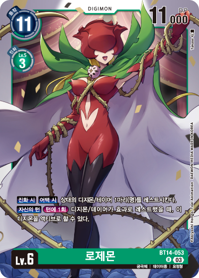 자신의 턴에만 발동되는 게 조금 아쉬운데, 로제몬 라인의 디지몬들은 DP가 좋은 편은 아니기 때문에 서로의 턴 효과였다면 어땠을까 생각해 본다