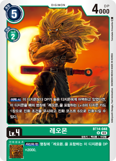 어택 시 DP가 더욱 높은 디지몬에게 어택하고 있었다면, 레벨 6 레오몬을 포함하는 카드로 워프진화가 가능하다.