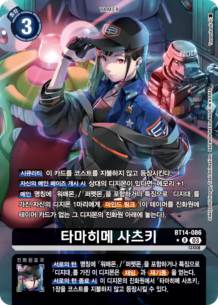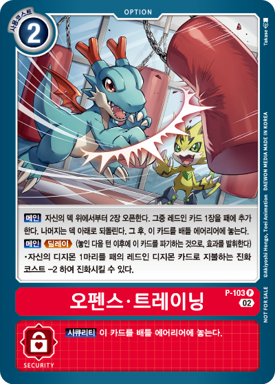 ・자신의 디지몬 1마리를 패의 레드인 디지몬 카드로 지불하는 진화 코스트 -2 하여 진화시킬 수 있다.