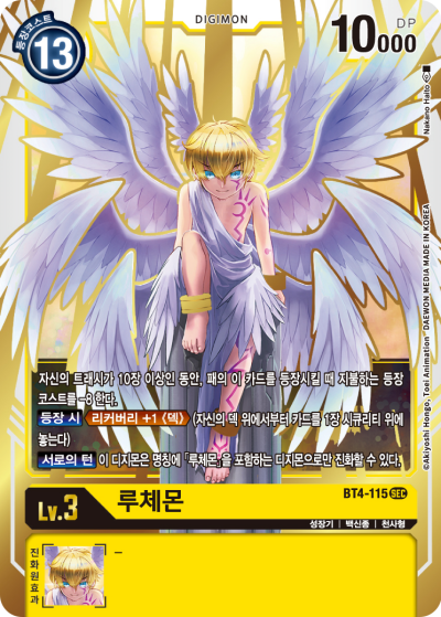 자체적인 진화 코스트에 트레이닝을 함께 한다면 5 코스트로 진화가 가능하겠지만, 루체몬이 이미 등장해야 한다는 점과 퍼플 트레이닝을 사양해야 한다는 점 등 실제적인 효용성은 떨어져 보인다.