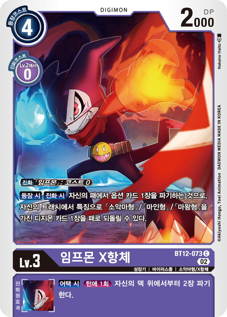 임프몬 X항체는 등장 시에도, 진화 시에도 패의 옵션 카드로 트래시의 소악마형, 마인형, 마왕형을 패로 되돌릴 수 있다.