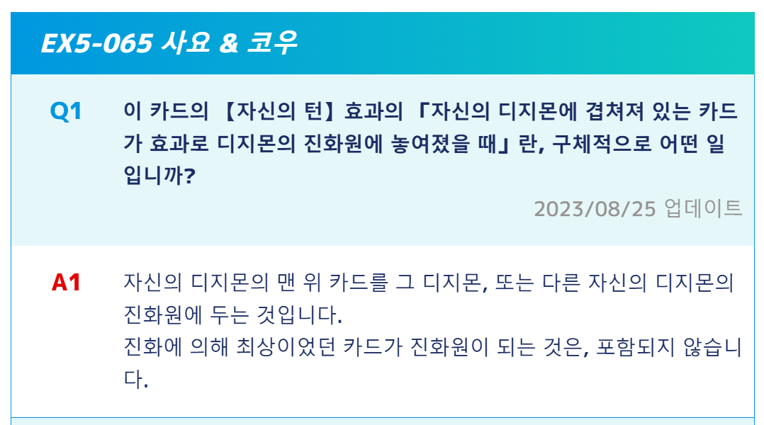 진화탑 맨 위의 카드를 이야기하며, 이 효과는 진화원이 없는 프로모 즈바몬의 효과로 진화원으로 들어가는 경우도 포함하기 때문에 사요&코우의 효과로 메모리를 받을 수 있다.