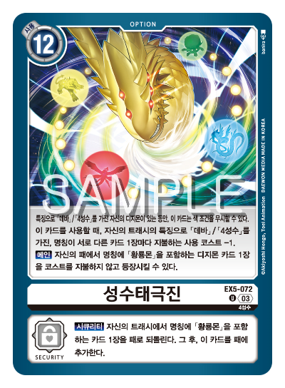 패에서 데바의 메인 카드인 황룡몬을 코스트 지불 없이 등장시킬 수 있는데, 보통 이런 류의 카드는 턴 종료 시에 다시 돌아가는 페널티를 가지고 있지만, 성수태극진은 이런 페널티가 없다는 점에 눈이 간다.