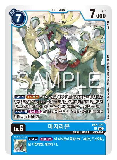 마지라몬은 턴에 1회이기는 하지만 자신이 1 코스트 이상의 옵션 카드를 사용할 때, 메모리를 되돌려주기 때문에 사성수의 전용 옵션이나 기타 옵션 카드를 활용하게끔 도와줄 것이다