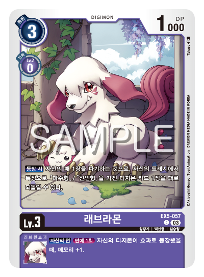 래브라몬은 등장 시 효과로 패 1장을 파기하고, 트래시에서 마수형/신인형 1장을 패로 되돌린다.