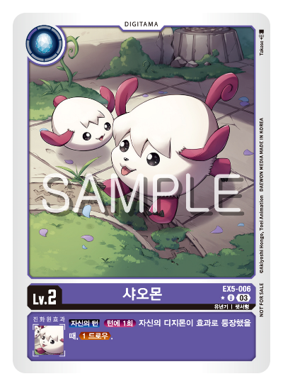 이전의 샤오몬이 길동무를 부여했다면, 이번 샤오몬은 디지몬이 효과로 등장했을 때 드로우를 보조해 준다.