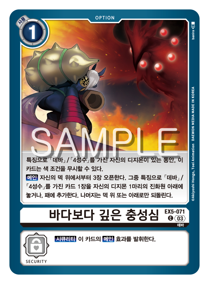 EX-5에서는 사성수가 ACE 카드로 새롭게 디자인되었으며, 독특한 메커니즘을 통해 다양한 데바 디지몬 카드들과 함께 플레이할 수 있습니다.