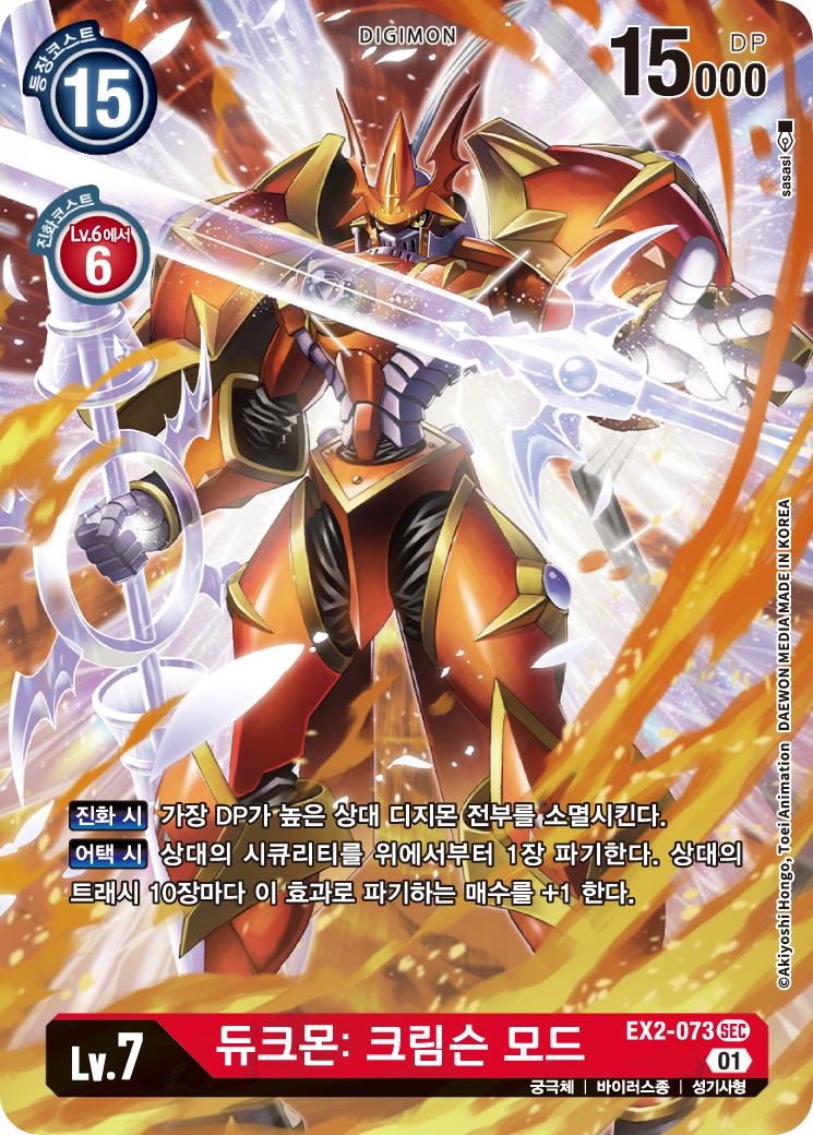 제가 이 덱을 상대로 취할 수 있는 유일한 전략은상대의 레벨 3~4 디지몬을 최대한 제거하면서 필드 유지를 방해하고, 듀크몬 X항체 → 크림슨 모드로 한 번에 큰 타격을 주는 것