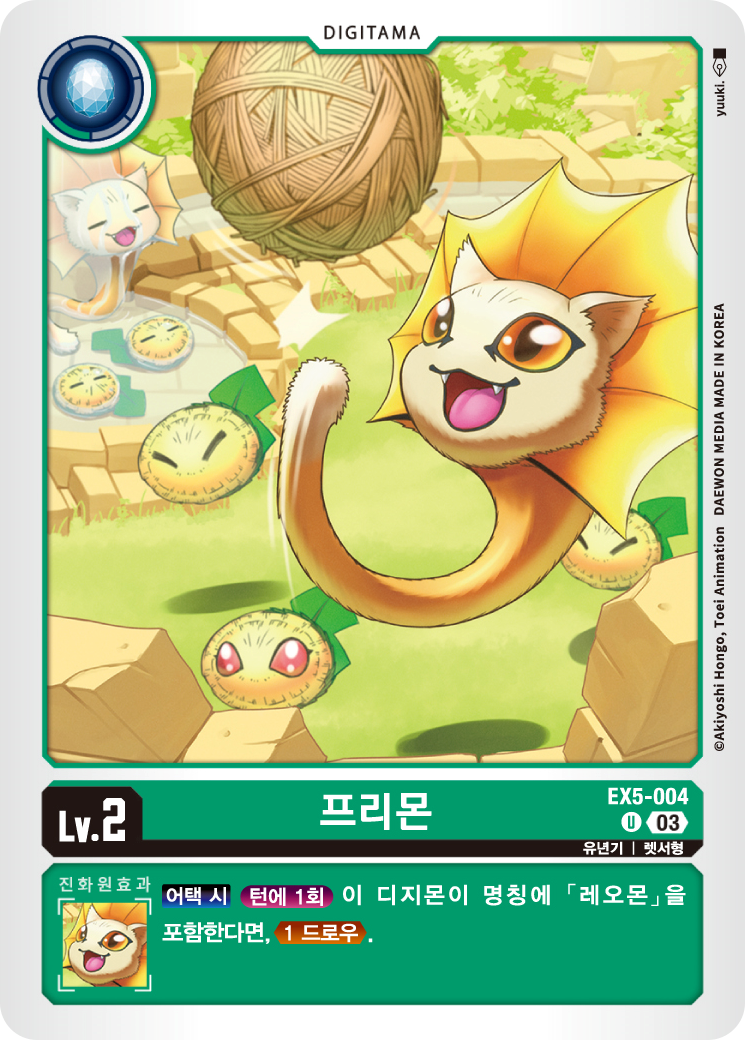반면 EX5 프리몬은 어택 시 효과로 명칭에 레오몬이 있다면 드로우를 추가해주기 때문에, 유틸적인 면에서 훌륭한 카드이기도 하다.